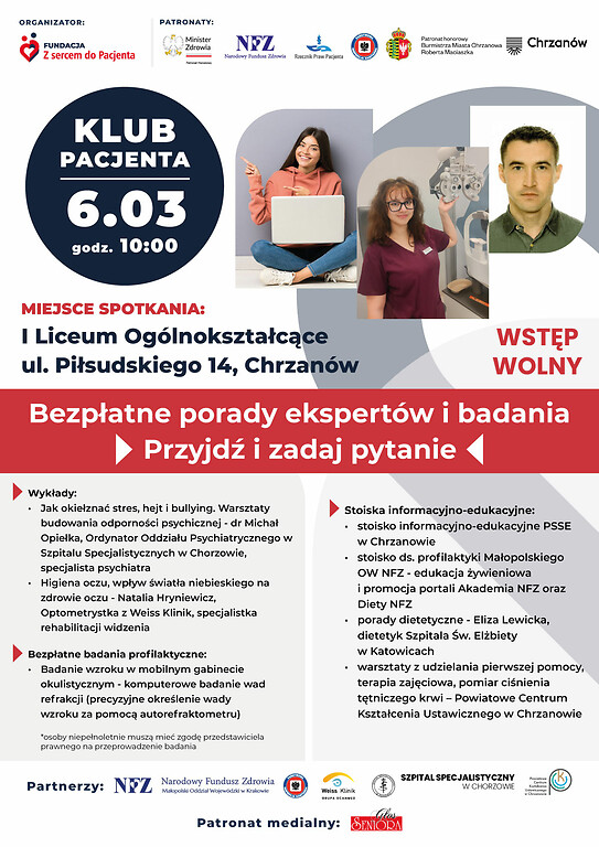 Młodzieżowy Klub Pacjenta w Chrzanowie to kolejna odsłona wydarzenia organizowanego przez Fundację z Sercem do Pacjenta, któremu patronuje Ministerstwo Zdrowia, Narodowy Fundusz Zdrowia oraz Rzecznika Praw Pacjenta. W inicjatywę po raz kolejny włącza się także małopolski NFZ.