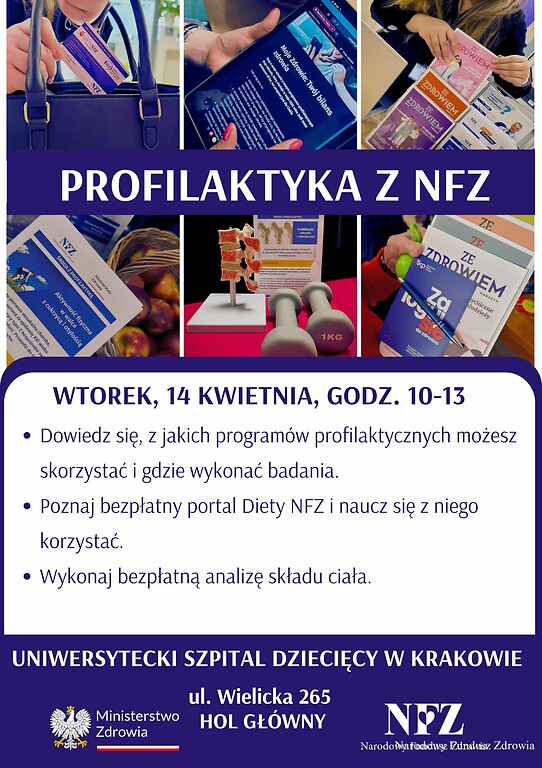 Kolejne z zaplanowanych spotkań w Uniwersyteckim Szpitalu Dziecięcym odbędzie się we wtorek 14 kwietnia. Przy stanowisku małopolskiego NFZ każdy zainteresowany będzie mógł bezpłatnie wykonać analizę składu ciała. Daje ona odpowiedź na pytanie o masę ciała i zawartość w organizmie wody, tkanki tłuszczowej czy mięśniowej. Doradcy wytłumaczą, gdzie badać się w programach profilaktycznych finansowanych przez NFZ i pokażą, jak jeść zdrowej z portalem Diety NFZ. Do rozmowy o profilaktyce szczególnie zapraszamy wnuki z babciami i dziadkami, którzy w tym tygodniu obchodzą swoje święto. Razem przekonamy ich, że super babcia i super dziadek dbają o zdrowie.