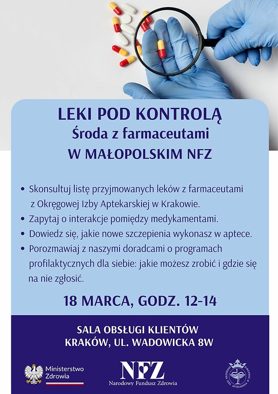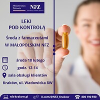 Najbliższe spotkanie z cyklu Środa z Farmaceutami. Leki pod kontrolą odbędzie się w środę 18 marca w godz. 12-14 w sali obsługi klientów małopolskiego NFZ (Kraków, ul. Wadowicka 8W). Konsultacje są bezpłatne, nie trzeba się wcześniej umawiać. Warto na spotkanie zabrać spisaną listę przyjmowanych leków albo opakowania preparatów.