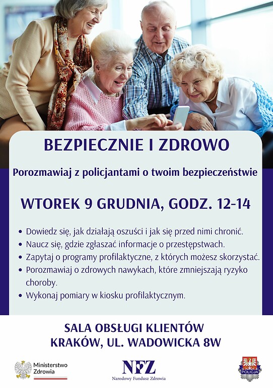 O tym, jak nie dać się nabrać „na wnuczka”, „policjanta” „odszkodowanie za szczepienie”, "apteczkę od NFZ" czy „dopłatę do paczki”, mówią małopolscy policjanci podczas specjalnych dyżurów w sali obsługi klientów małopolskiego NFZ (Kraków, ul. Wadowicka 8W). Kolejny z nich zaplanowano w najbliższy wtorek w godz. 12-14. Spotkanie z przedstawicielami Komendy Wojewódzkiej Policji w Krakowie to okazja, by poznać metody stosowane przez przestępców, skuteczne sposoby profilaktyki i zasady działania, gdy padniemy ofiarą oszustwa.