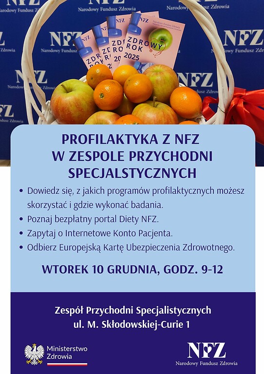 Doradcy małopolskiego NFZ regularnie będą pojawiać się m.in. w tarnowskim Zespole Przychodni Specjalistycznych (Tarnów, ul. M. Skłodowskiej-Curie 1). Najbliższe spotkanie w tej placówce odbędzie się w środę 12 listopada w godz. 9-12. To okazja, by zapytać o badania profilaktyczne finansowane przez NFZ i Ministerstwo Zdrowia, poznać portal Diety NFZ i program treningowy stworzony przez NFZ 8 tygodni do zdrowia. Doradcy odpowiedzą na pytania związane z leczeniem w ramach publicznego systemu ochrony zdrowia, pobytem w sanatorium, refundacją wyrobów medycznych czy korzystaniem z Internetowego Konta Pacjenta.